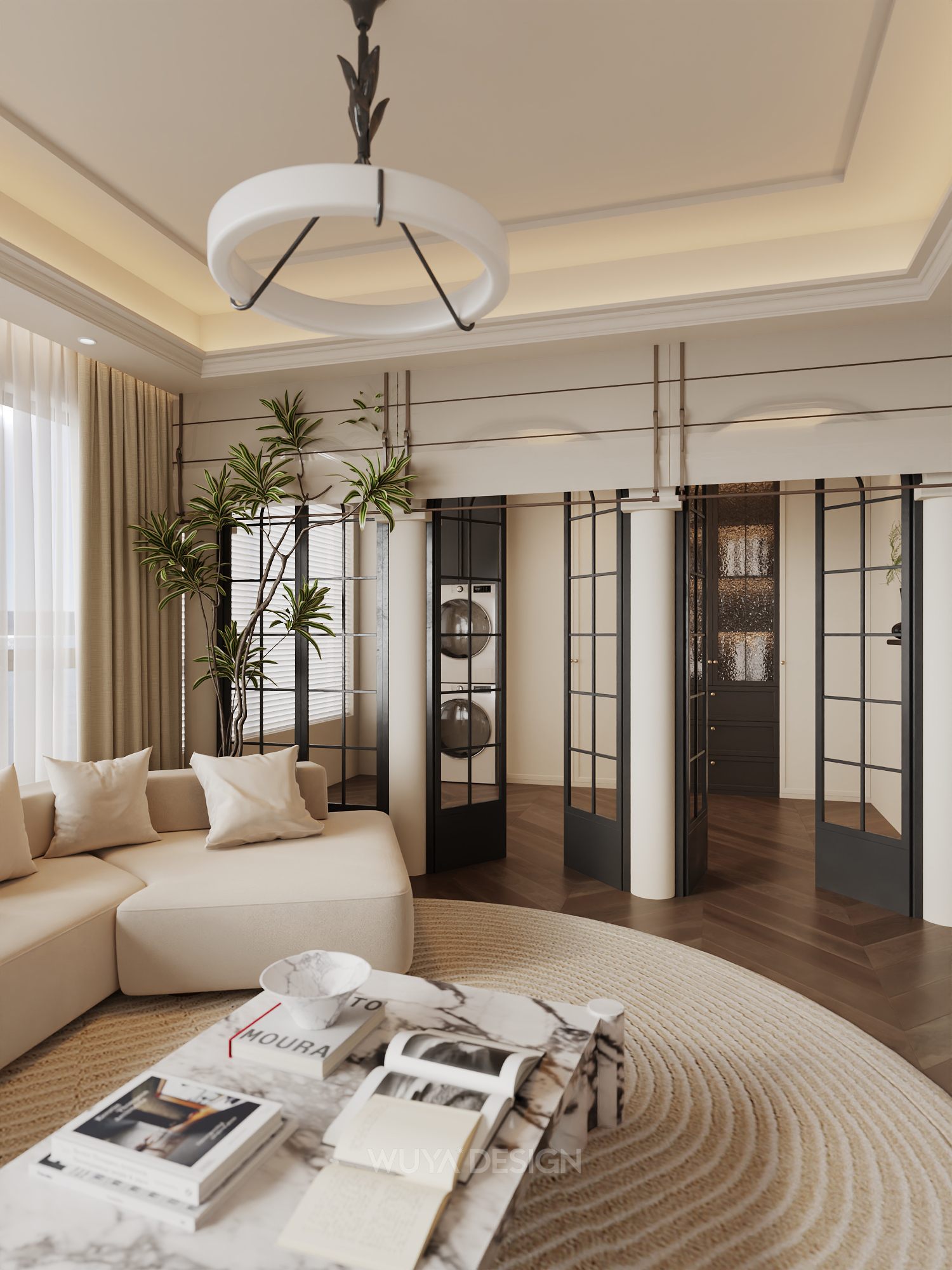 📍青山印165的案子,一个过程稿。户型特色是面朝赣江,特点是公区与卧室完全分开 布局上选择打开厨房变成开放式的LDK布局,亚麻材质的沙发自带慵懒的松弛感, 在客厅角落隔出了一间书房,开放式的布局可开可合,不显小反而让空间增添了个层次。