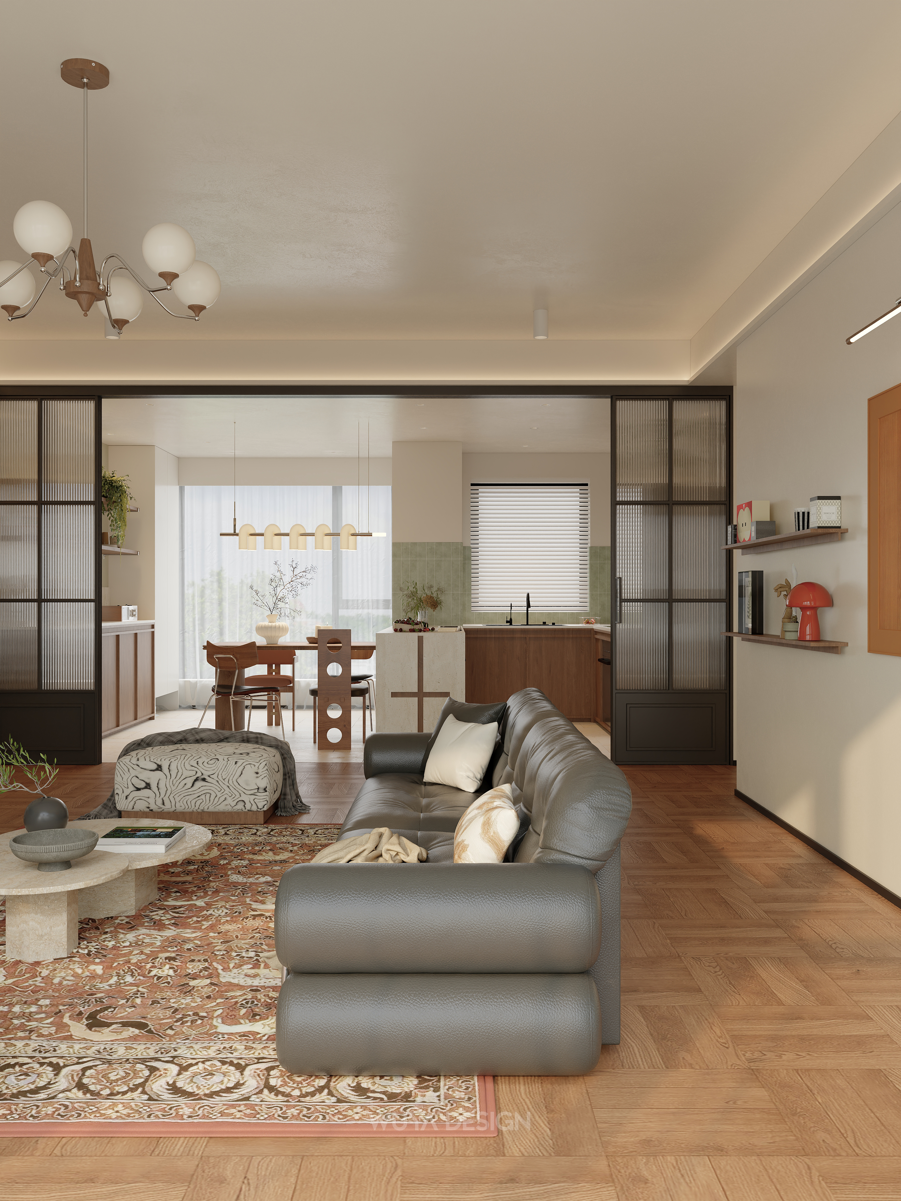 新设计的中古风小家,犹如电影画面一般 中古风少不了黑白棕的配色,先给客厅C位安排了黑色复古直排沙发,搭配一张大大的繁花地毯,整体的调调就算打下啦