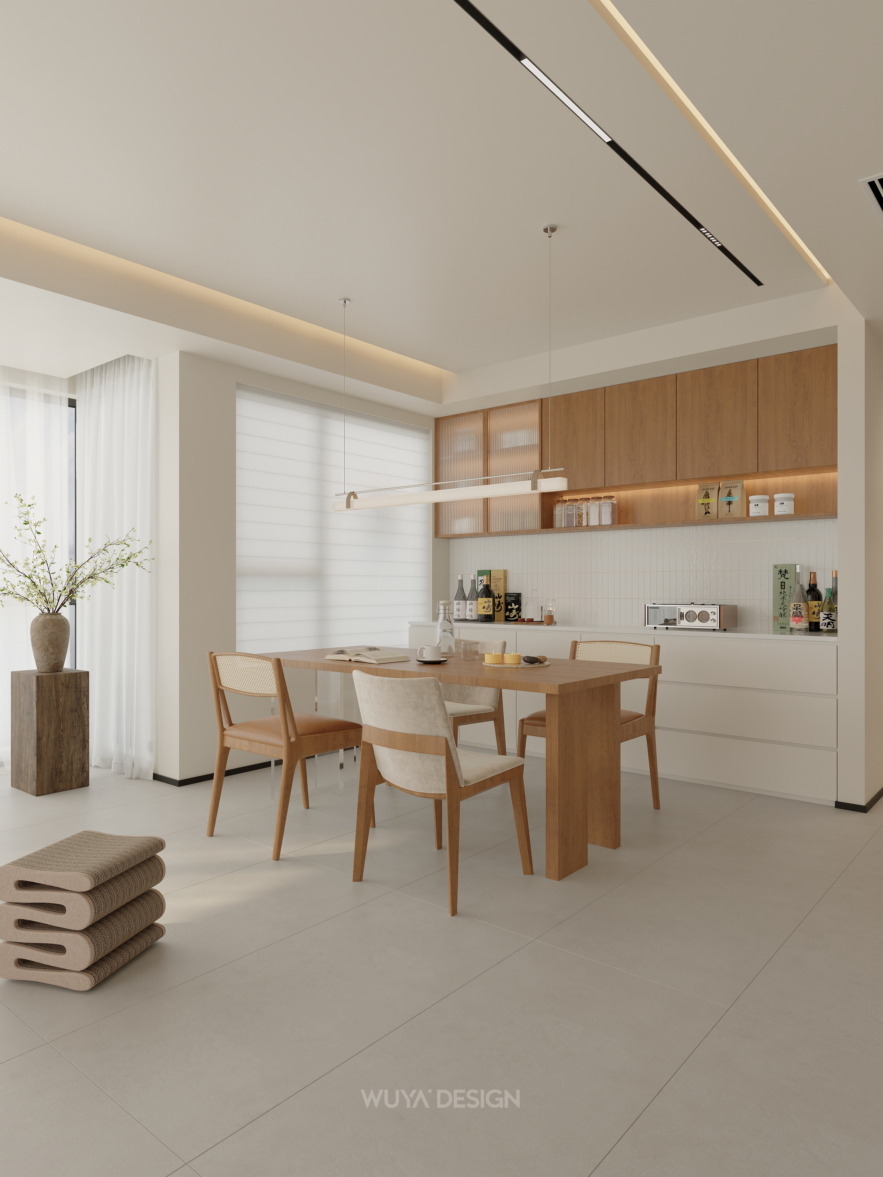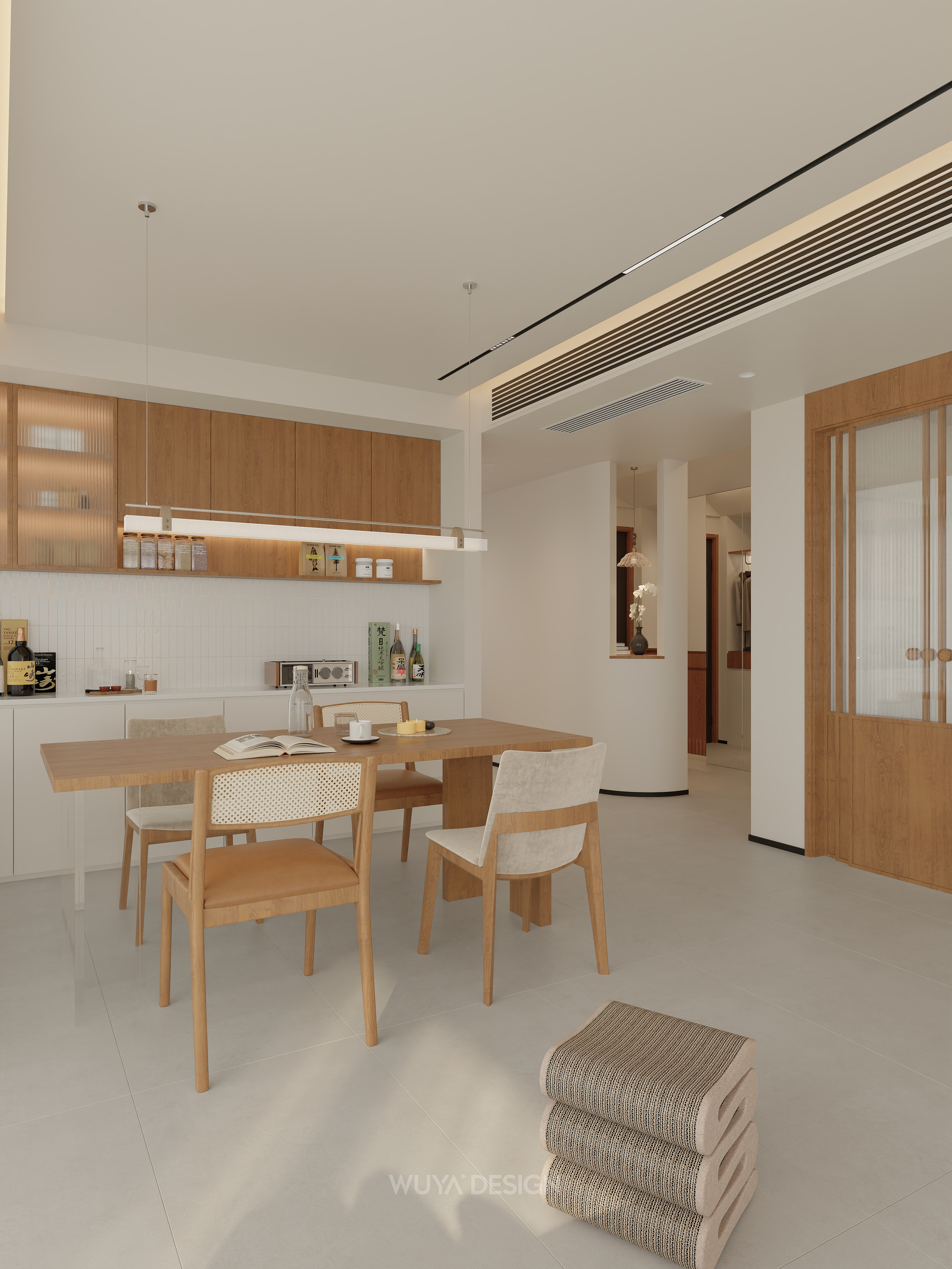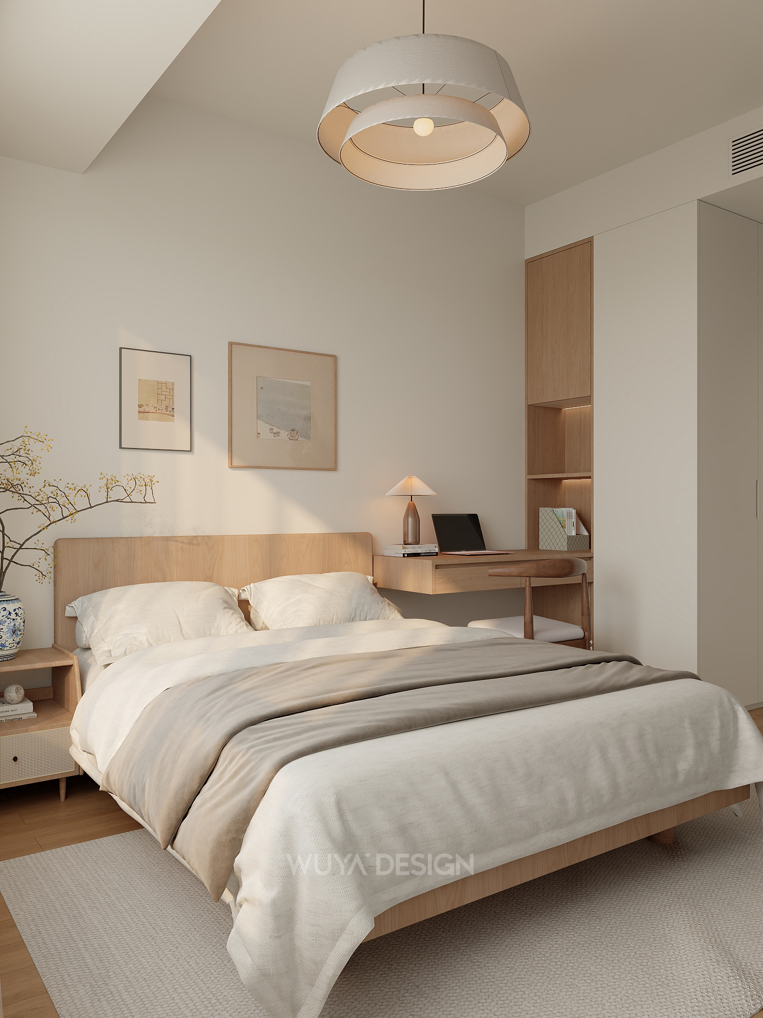 以原木色为核心,搭配白色或低饱和度素色,营造自然、柔和、安静的居家氛围。原木色家具、地板与白墙相得益彰,大量运用樱桃木、白橡木、胡桃木等天然木材,保留木材的原始纹理和温润触感,通常与白色、奶黄色、奶咖色、棕色、原木色等低饱和度的颜色相搭配,创造出轻盈的肤感裸色效果。