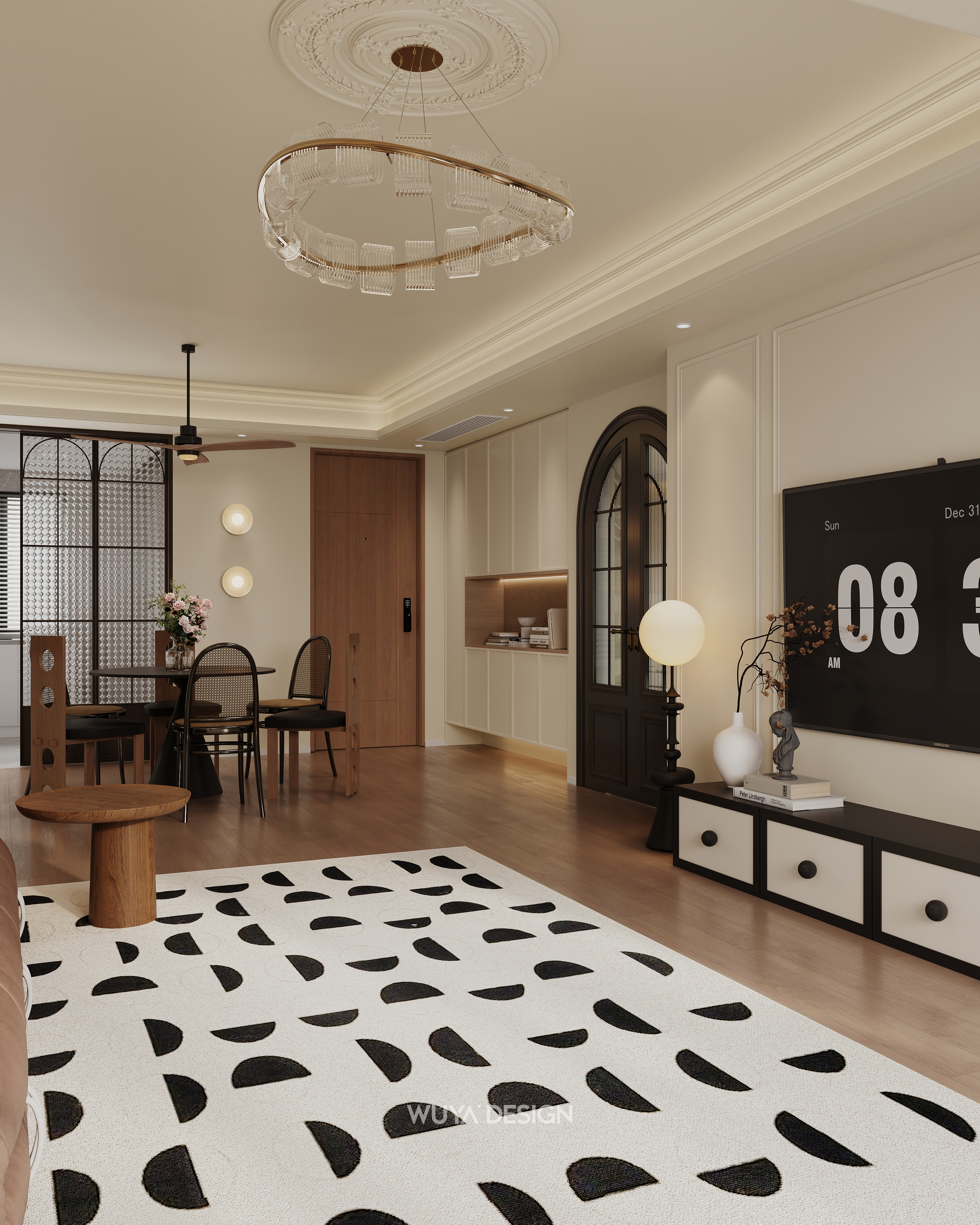 一进入房间,自带的木地板如同一大片温润的海洋,平静而有序地通铺开来。客厅中那大面积的落地窗,恰似一面巨大的镜子,慷慨地引入充足而明亮的光线,让整个空间宛如被阳光精心拥抱。搭配上简约时尚的一字型沙发,沙发柔软的质感仿佛云朵般轻柔,进一步将空间的柔软与舒适感放大。天花板采用无主灯设计,这样的设计就像是给视觉施了魔法,使得层高在视觉上更显宽敞,仿佛置身于一个开阔无垠的空间之中。