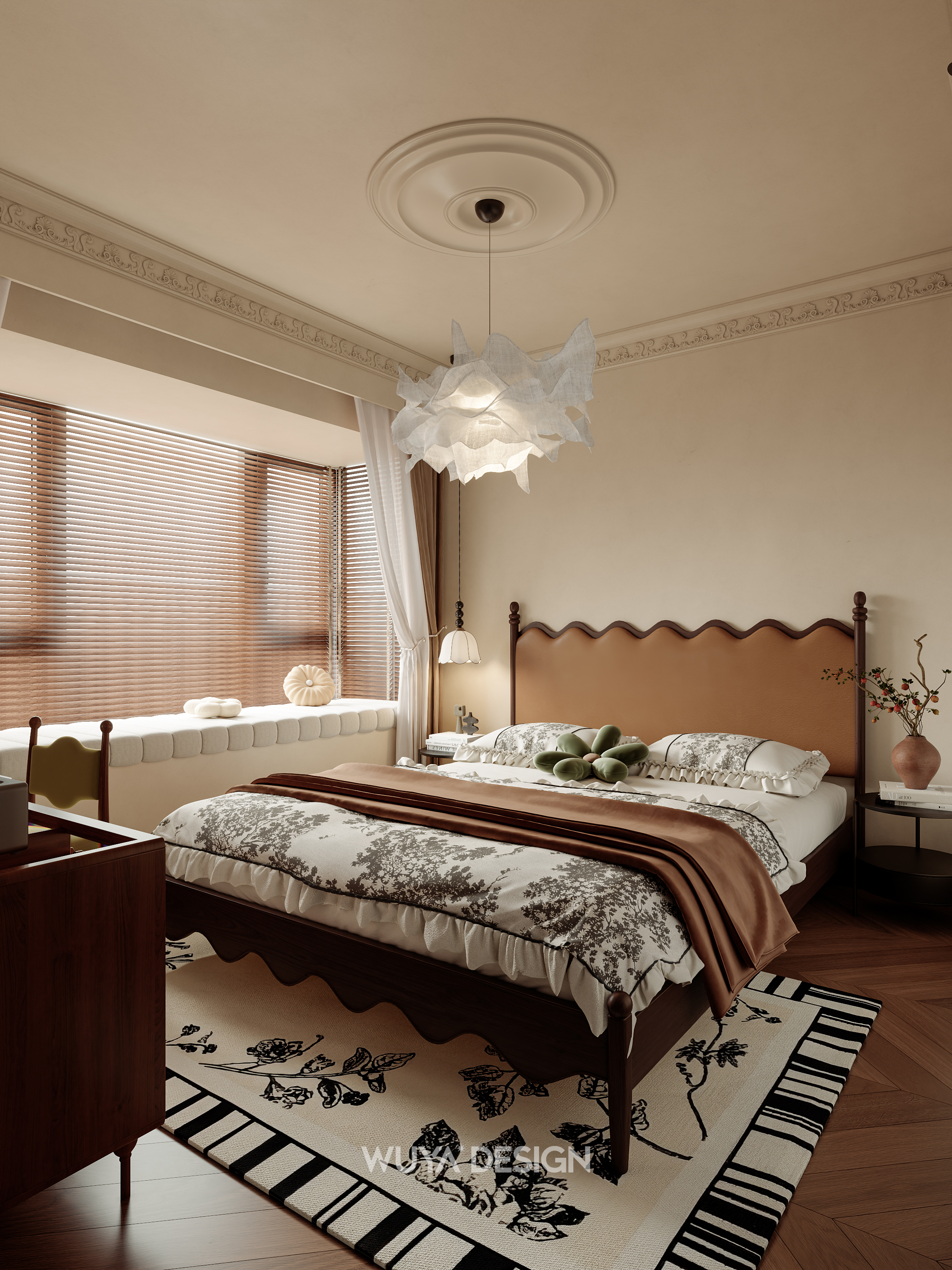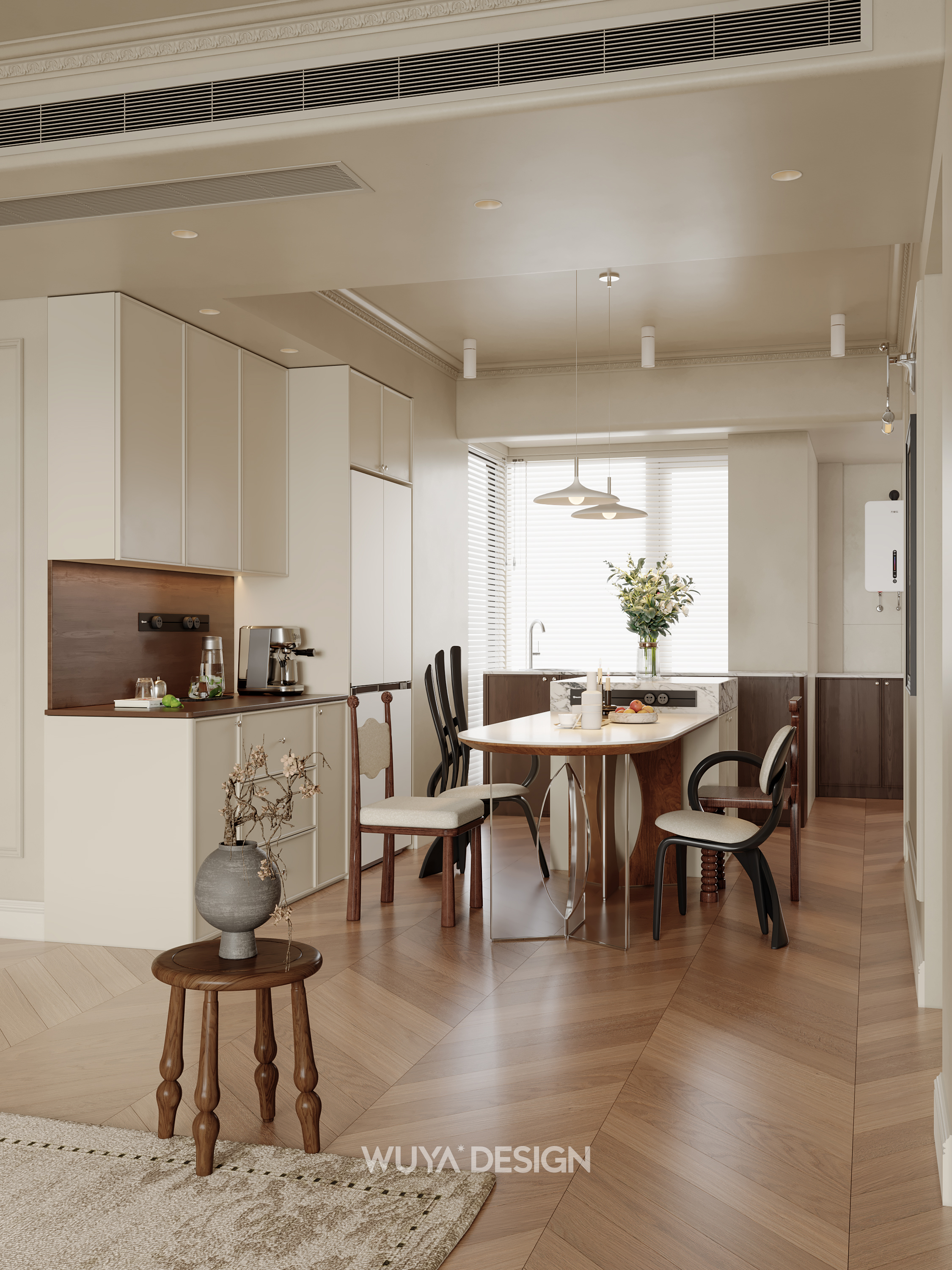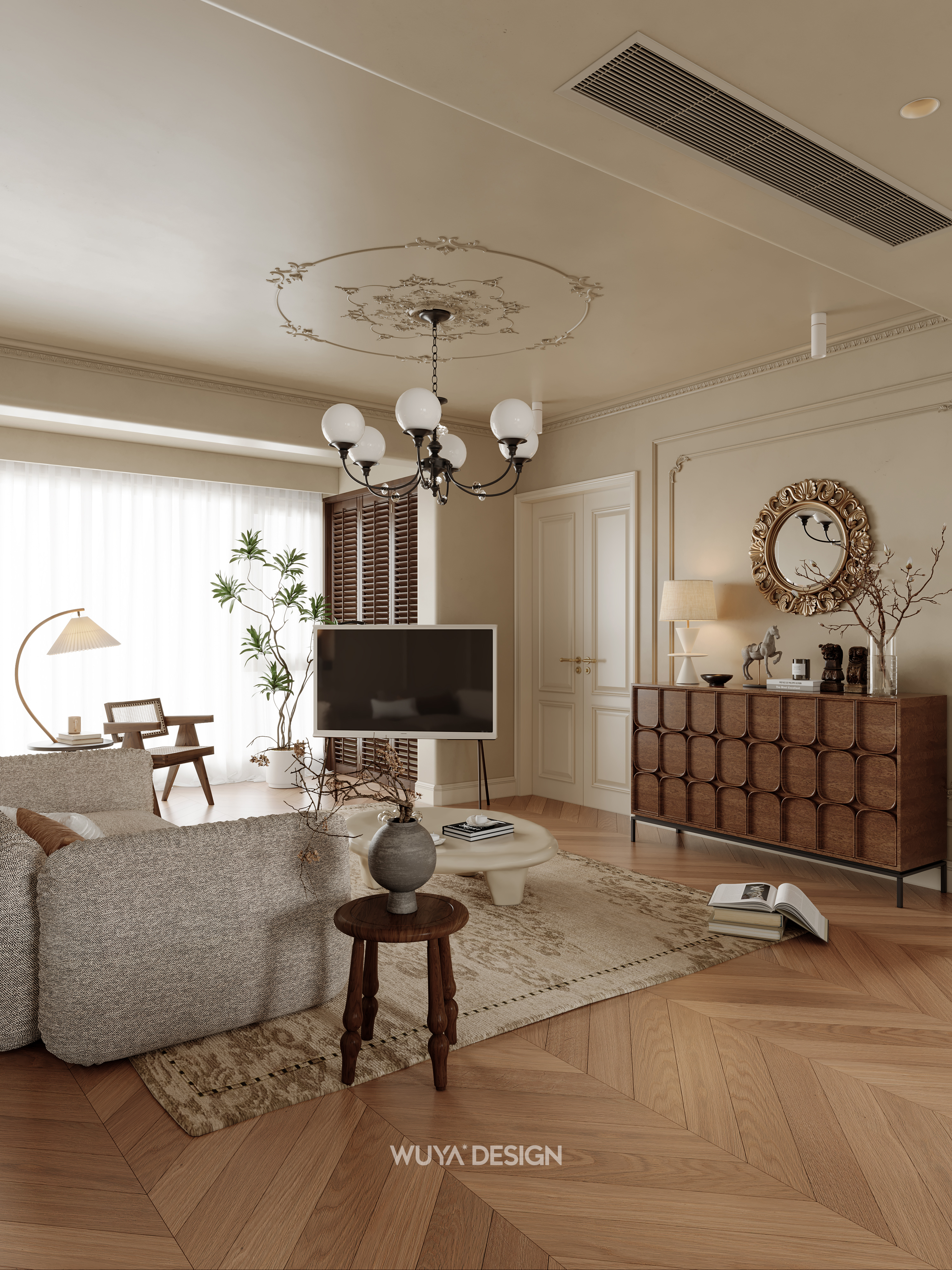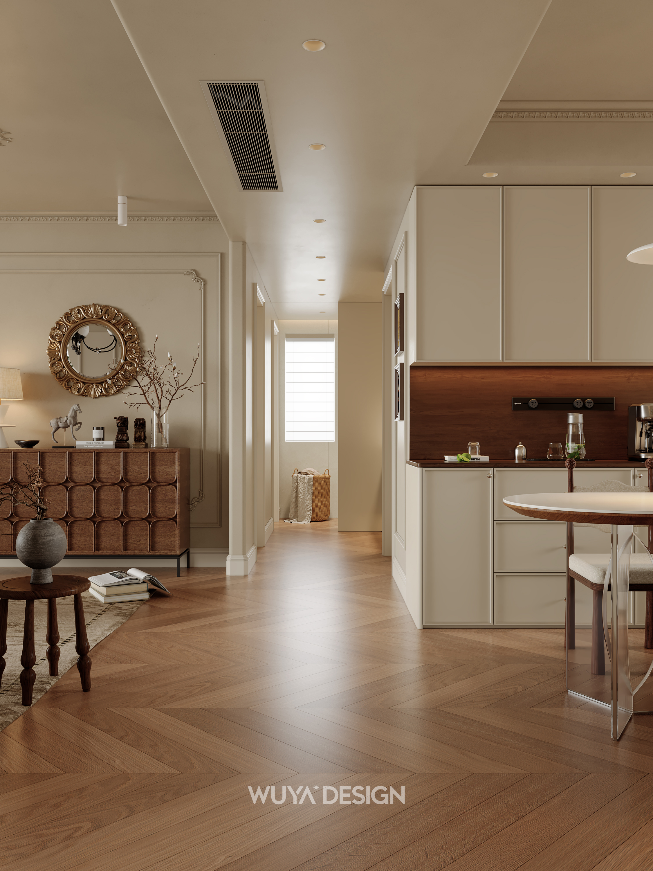 🤎硬装上选择胡桃色鱼骨拼的木纹砖进行通铺,美观又好打理~ 🤎搭配石膏灯盘、线框、胡桃木百叶门、骨格线,让家瞬间变成浪漫的法式复古小窝~