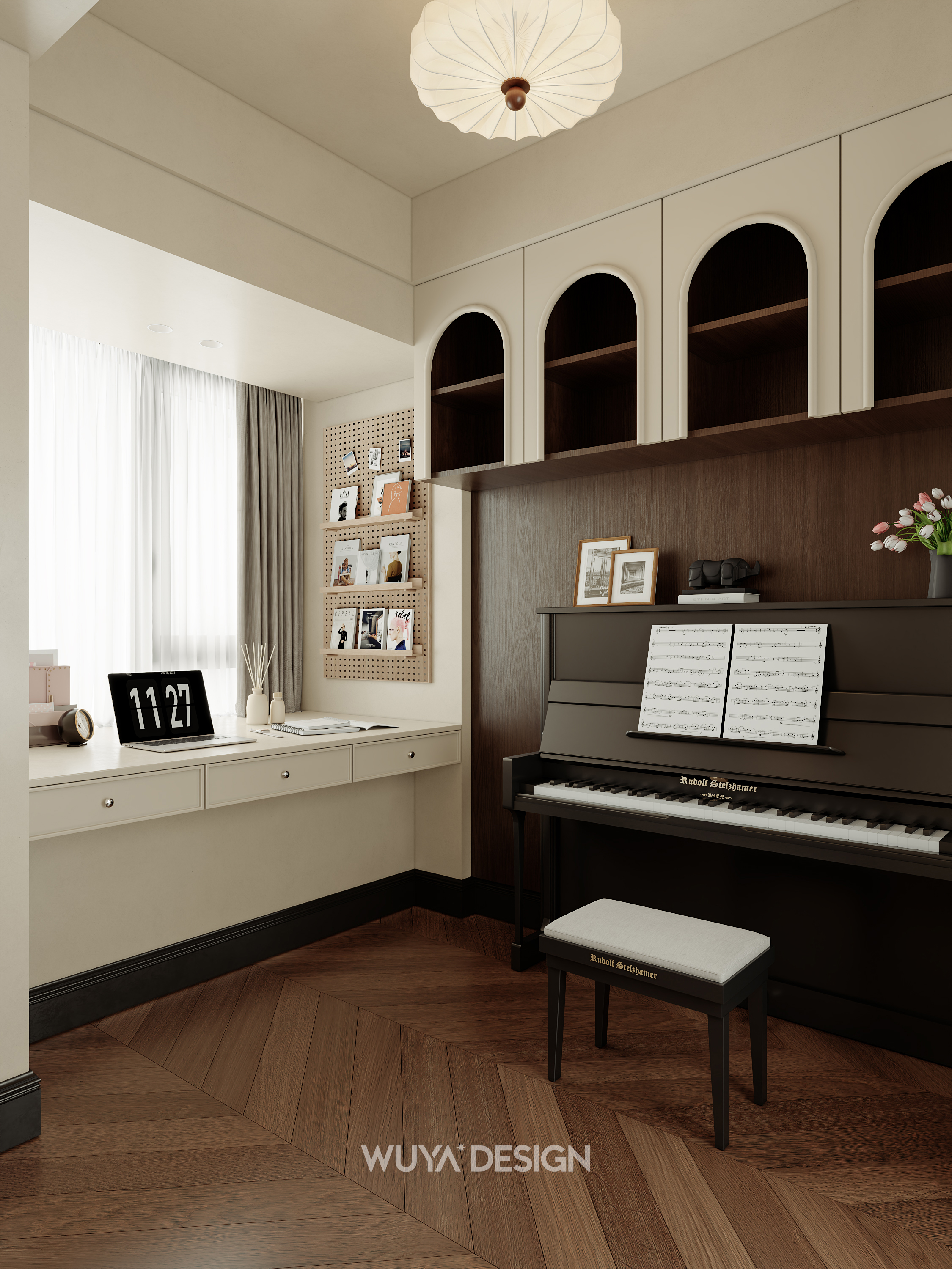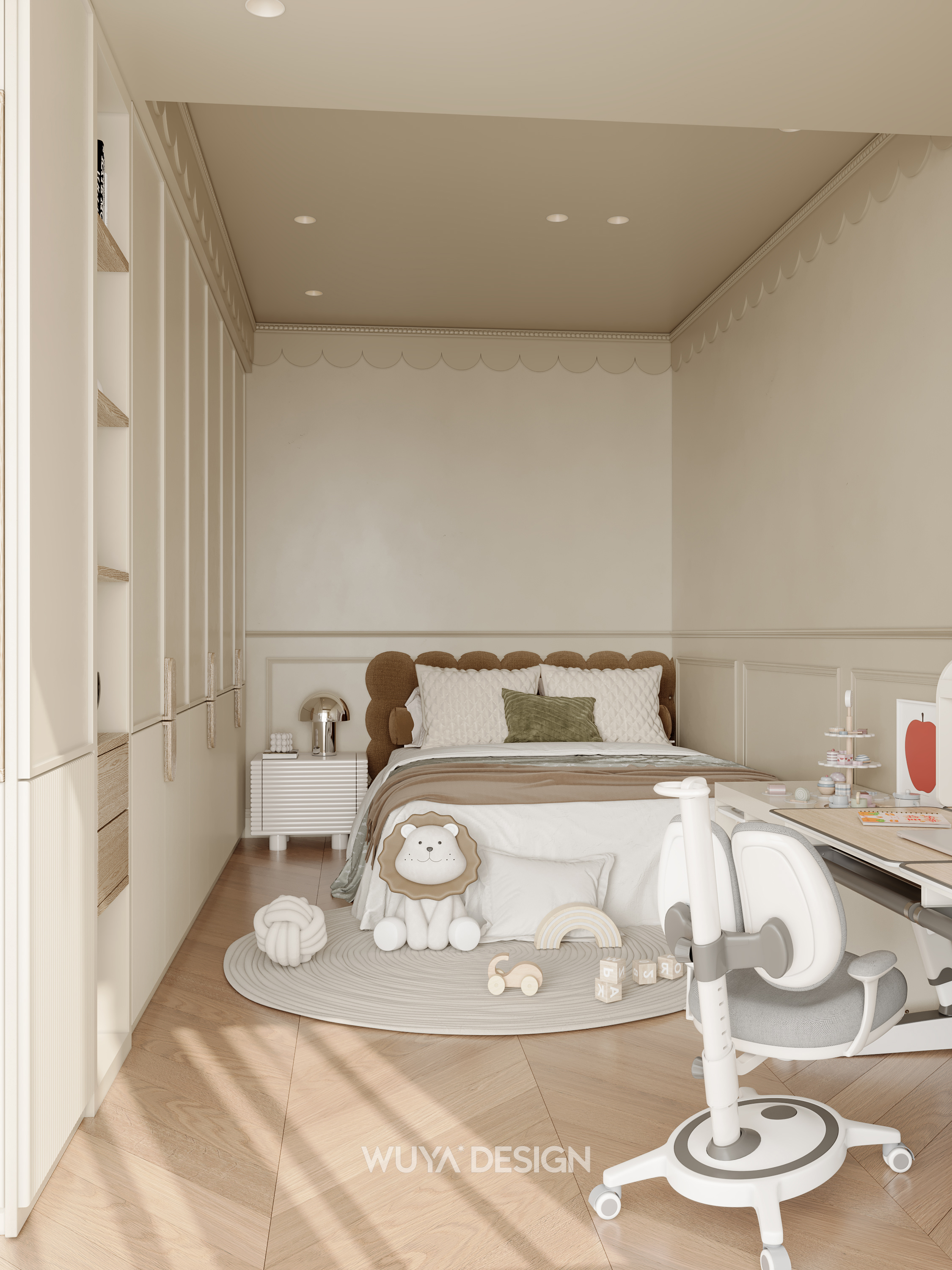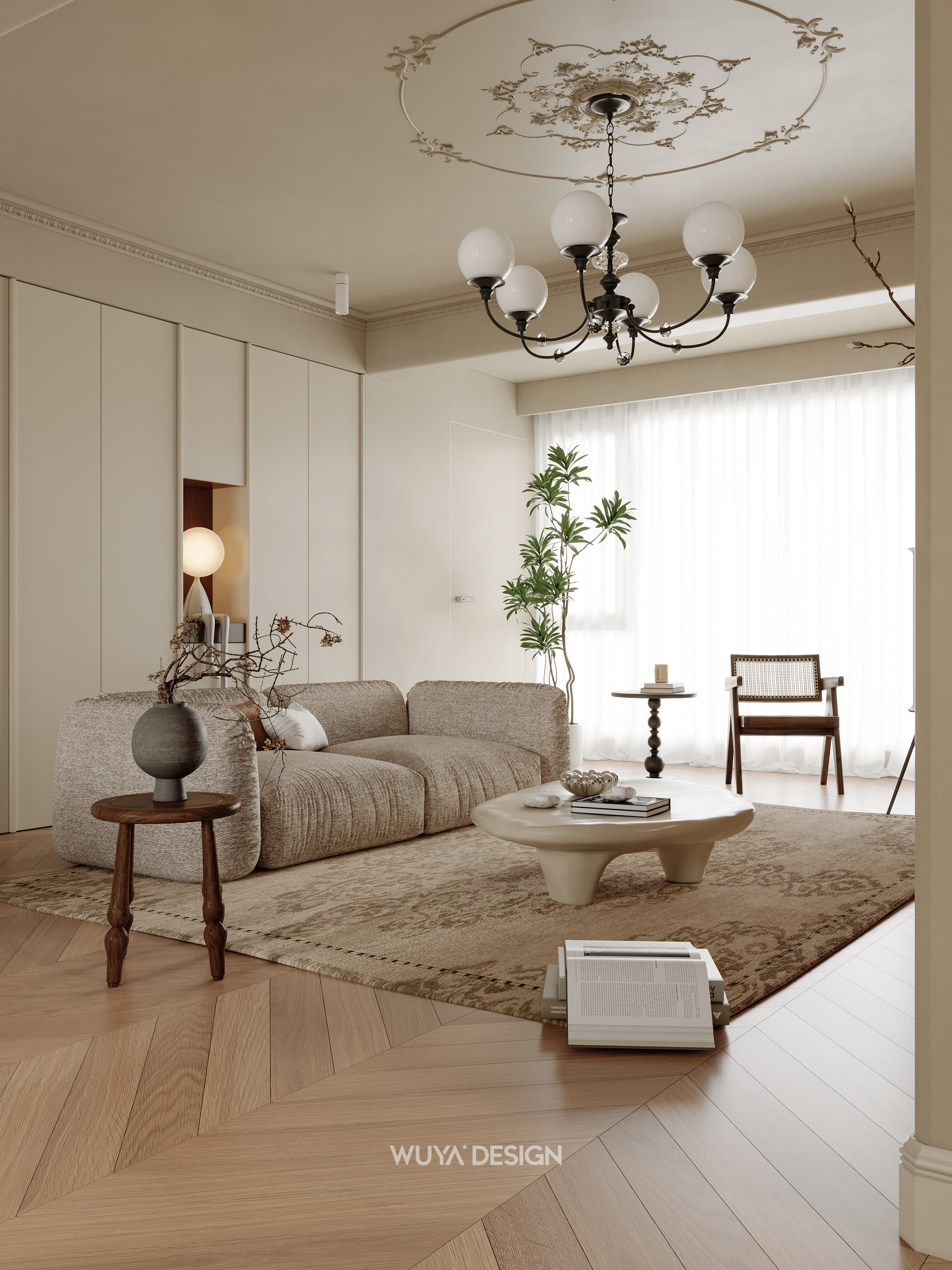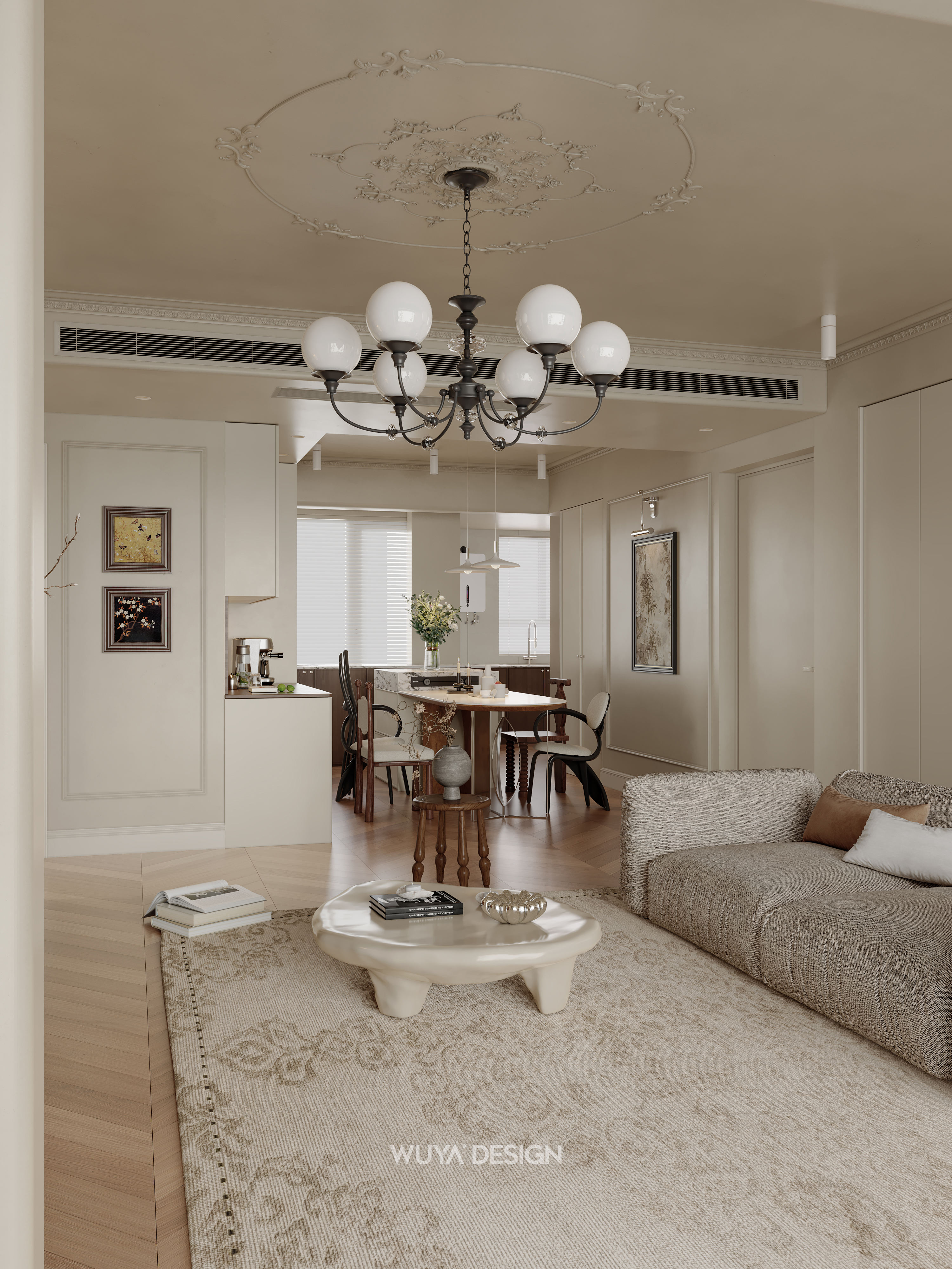 🤎硬装上选择胡桃色鱼骨拼的木纹砖进行通铺,美观又好打理~ 🤎搭配石膏灯盘、线框、胡桃木百叶门、骨格线,让家瞬间变成浪漫的法式复古小窝~